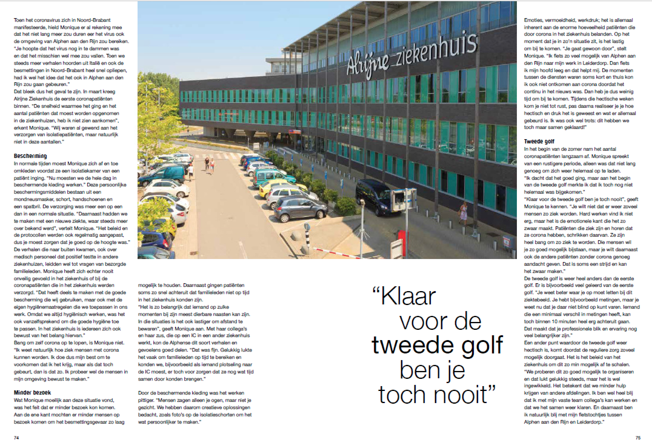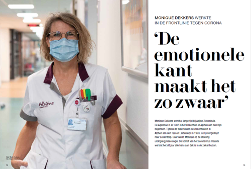 Onze collega Monique Dekkers vertelt in het magazine van Alphens.nl hoe haar jaar op de corona verpleegafdeling is geweest. Hoe hectisch het is geweest en emotioneel, hoe belangrijk haar collega’s zijn en hoe ze haar hoofd leegmaakt tijdens haar fietstochtjes tussen Alphen en Leiderdorp.