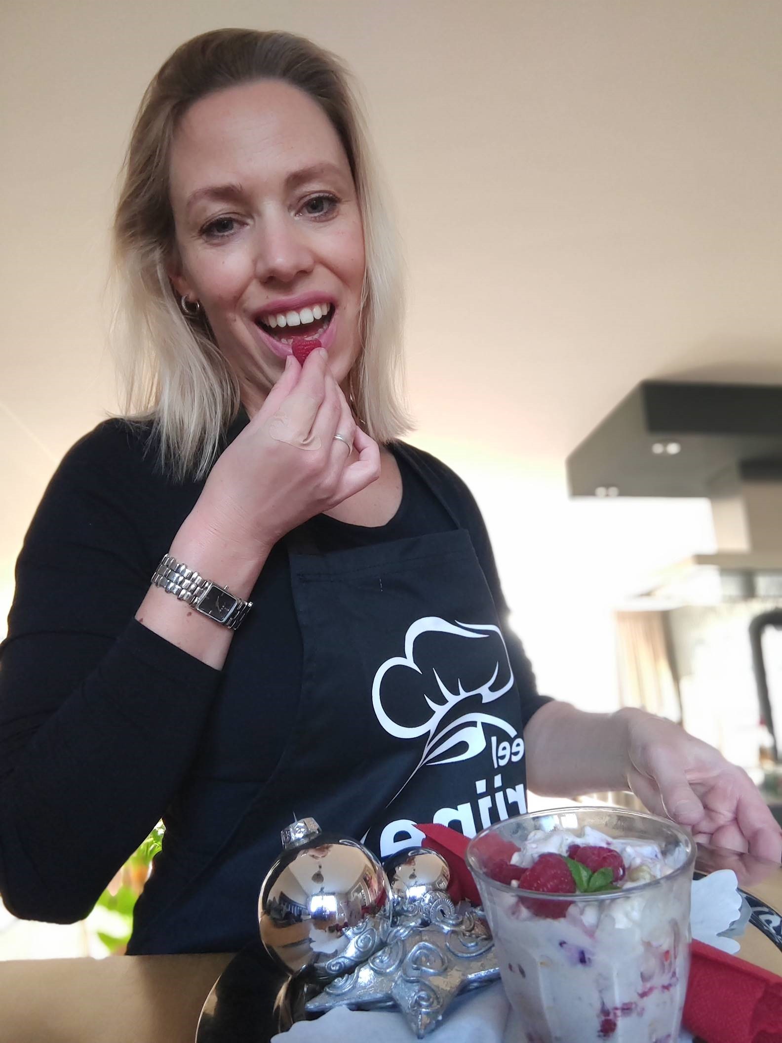 Als je diepvries fruit gebruikt kun je het dessert iets eerder maken. De bevroren frambozen zorgen dat “the mess” minder snel uitzakt.