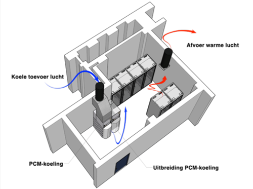 PCM (Phase Change Material) slaat warmte op en geeft deze af door van vast naar vloeibaar te gaan en weer terug. In een serverruimte wordt PCM gebruikt om de temperatuur te regelen door de warmte van de servers op te nemen als het te warm wordt.