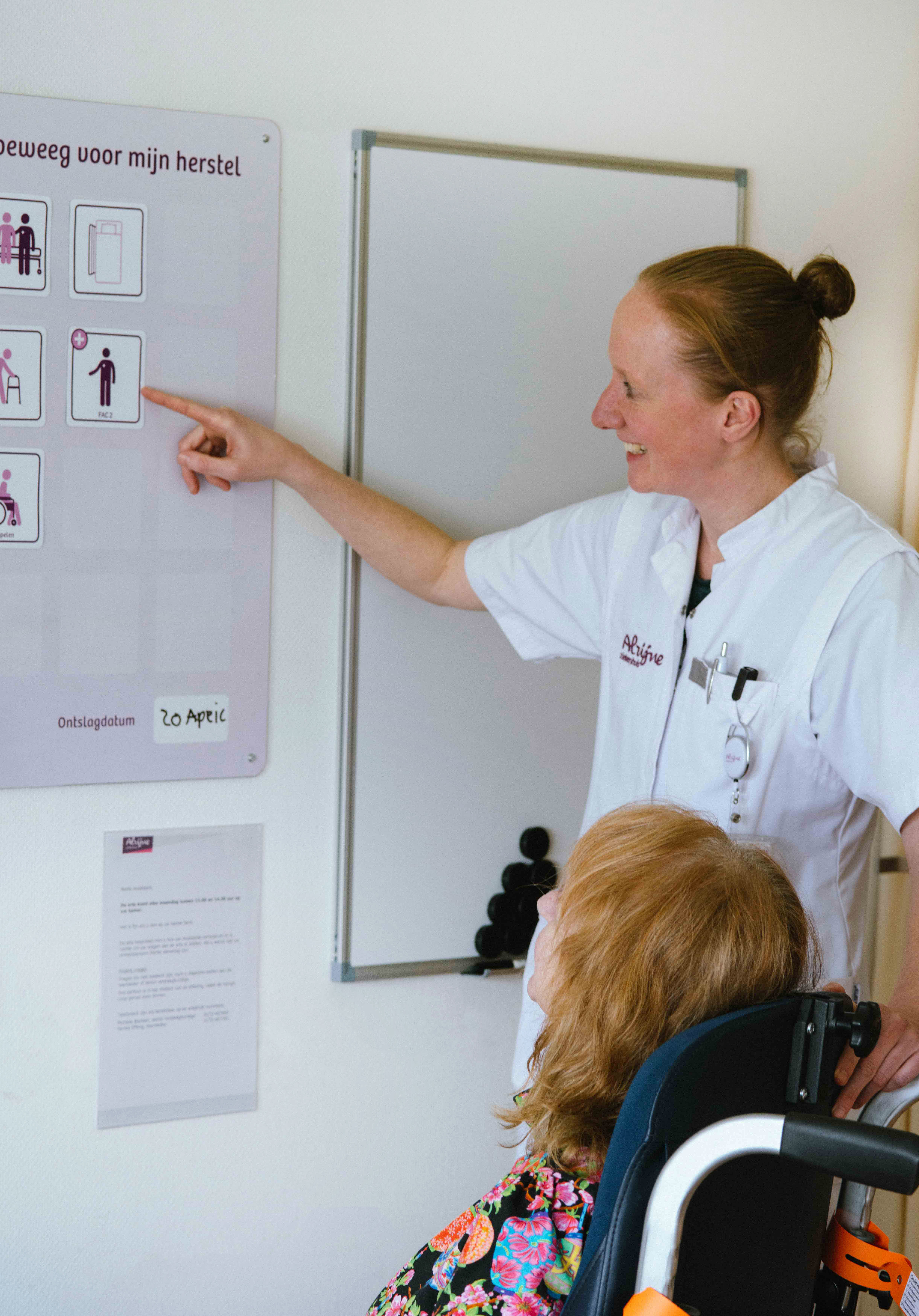 Mevrouw van Diejie is aan het revalideren in Alrijne Ziekenhuis Alphen. Na een ongelukkige val heeft zij een polsbreuk en meerdere fracturen in het bekken. Na enige tijd op de verpleegafdeling Chirurgie in Leiderdorp, verhuist zij naar de revalidatieafdeling om daar te werken aan haar herstel. “In het begin kon ik helemaal niet bewegen en had ik erg veel pijn. Ik mag nog niet lopen, maar ik kan wel alweer even staan en krijg steeds een stukje meer mijn zelfstandigheid terug. Ik vind het heel prettig dat het beweegbord er is. Zo ziet iedereen meteen hoe ze mij het beste kunnen ondersteunen en het werkt motiverend als ik zie dat ik vooruitga.”