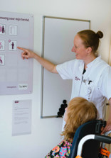 Cor Gräper legt uit: “Natuurlijk staat in het dossier precies wat iedere revalidant wel of niet kan, maar er staan geen computers op de patiëntenkamers. Daarnaast ben je ook snel geneigd als zorgverlener om hulp te bieden; dat je even de benen optilt, als je ziet dat iemand moeite heeft om in bed te komen. Maar als iemand wat verder is in het herstel, moeten ze bepaalde dingen juist zelf leren en oefenen. Het doel van de borden is dan ook de revalidanten de juiste uitdaging te bieden, maar het wel veilig te houden.”