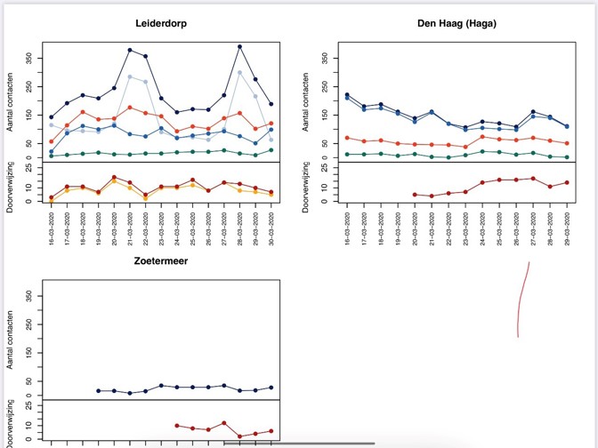 Het is mooi om te zien hoe de huisartsenpost corona in Leiderdorp functioneert. Zij aan zij staan professionals uit vele huisartsenpraktijken met medisch specialisten van Alrijne en LUMC de van corona verdachte patiënten te woord. Bij een sterke verdenking op corona kan, dankzij een tijdelijke CT bij de ingang, meteen een CT-thorax worden gemaakt. Bekijk in onderstaande grafieken het aantal verwijzingen in de regio.